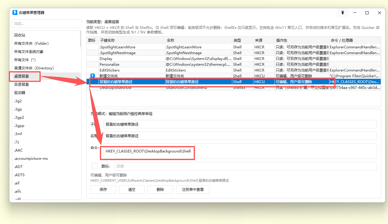 HKEY_CLASSES_ROOT\DesktopBackground\Shell:计算机桌面背景的右键菜单路径