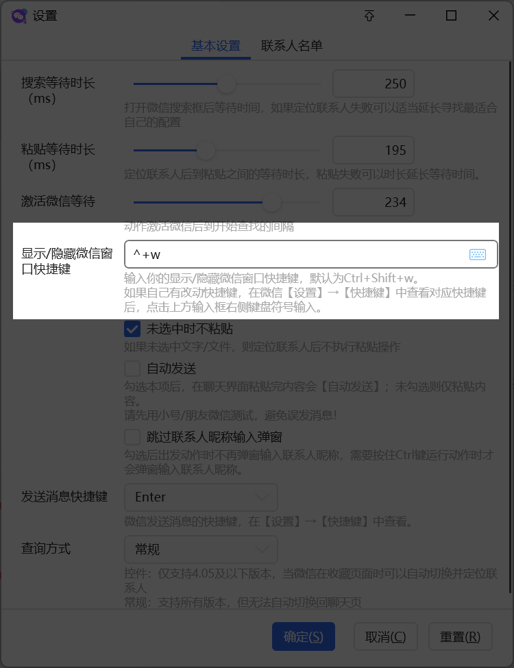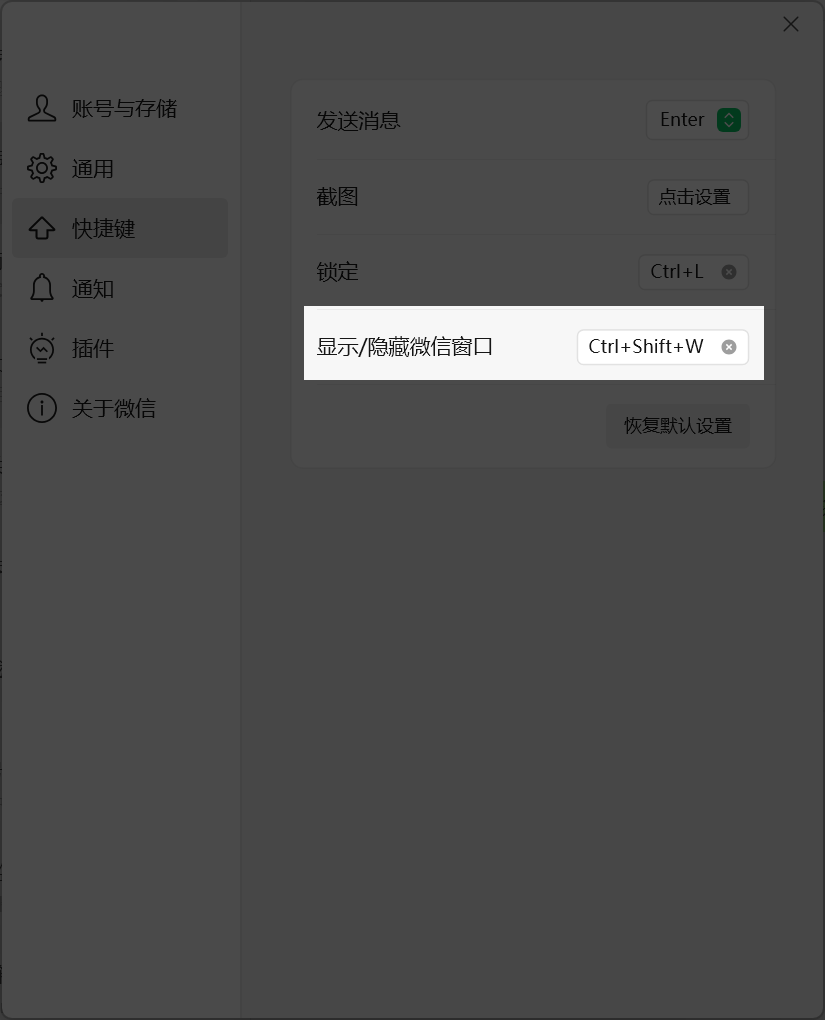 Ctrl + Shift + W - 关闭右侧所有标签页这两个快捷键和微信的激活快捷键冲突了,把你的微信激活快捷键设置成其他快捷键,然后动作的设置页里同步改一下微信激活快捷键,应该就可以了。