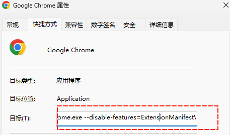如果双击打开,桌面的快捷方式的chrome,修改代码后,不受支持的清单是可以运行的之后找到了chrome的安装目录,想直接修改运行程序的chrome,但是无法在目标里面添加那串代码脚本可以指定运行那个 修改后的chrome快捷方式么,运行脚本后直接打开chrome,支持扩展