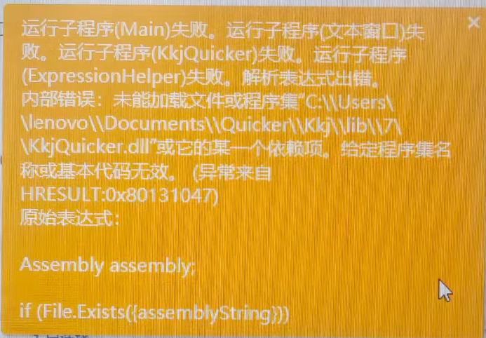 绝对不应该,在该动作主页,点击预览动作定义,可以看到子程序kkjquicker已经删了。报错还是这个?我进行重新安装,删除重装,都可以正常运行。