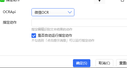 用这个【微信OCR - by ZTOA】如果这个动作还是不能用,可能你的情况和我一台电脑一样,CPU不支持微信OCR;那么只能换一个接口用了