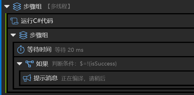 if(!(bool)context.GetVarValue("isSuccess")) return;,并将是否成功的结果写入isSuccess变量。 - 使用一个多线程步骤组包裹该步骤,并加入一个与编译并行的步骤组,内容为等待超时后判断编译是否完成(