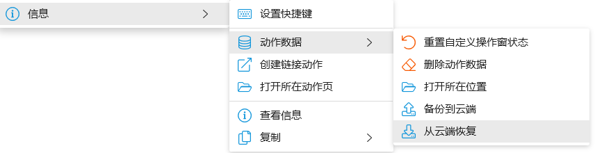每个动作的数据云端备份数量为6份(暂定),可随时从云端拉取不同版本备份文件进行恢复(对应动作右键-信息-动作数据-从云端恢复)