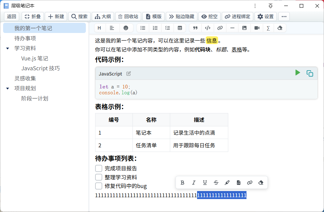 2. 新增可以锁定文档树和中间条 3. 新增顶部按钮自由排序 4. 新增可以设置笔记字体颜色 5. 新增笔记自动本地备份 6. 新增返回上个文档的功能, 最多记录10个 7. 新增代码块可以对选中代码进行整体缩进和反缩进, 并且可以支持修改语言 8. 新增模版功能, 使用/来快速选择模版 9. 新增点击表格时, 在表格上方显示表格的按钮栏 10. 新增视频嵌入功能 11. 工具栏增加链接按钮 12. 工具按钮增加快捷键功能 13. 优化界面UI 14. 优化搜索功能, 支持定位到具体内容上 15. 修改笔记保存方式为实时保存 (之前是关闭窗口保存) 16. 修改使用默认浏览器打开链接 |
