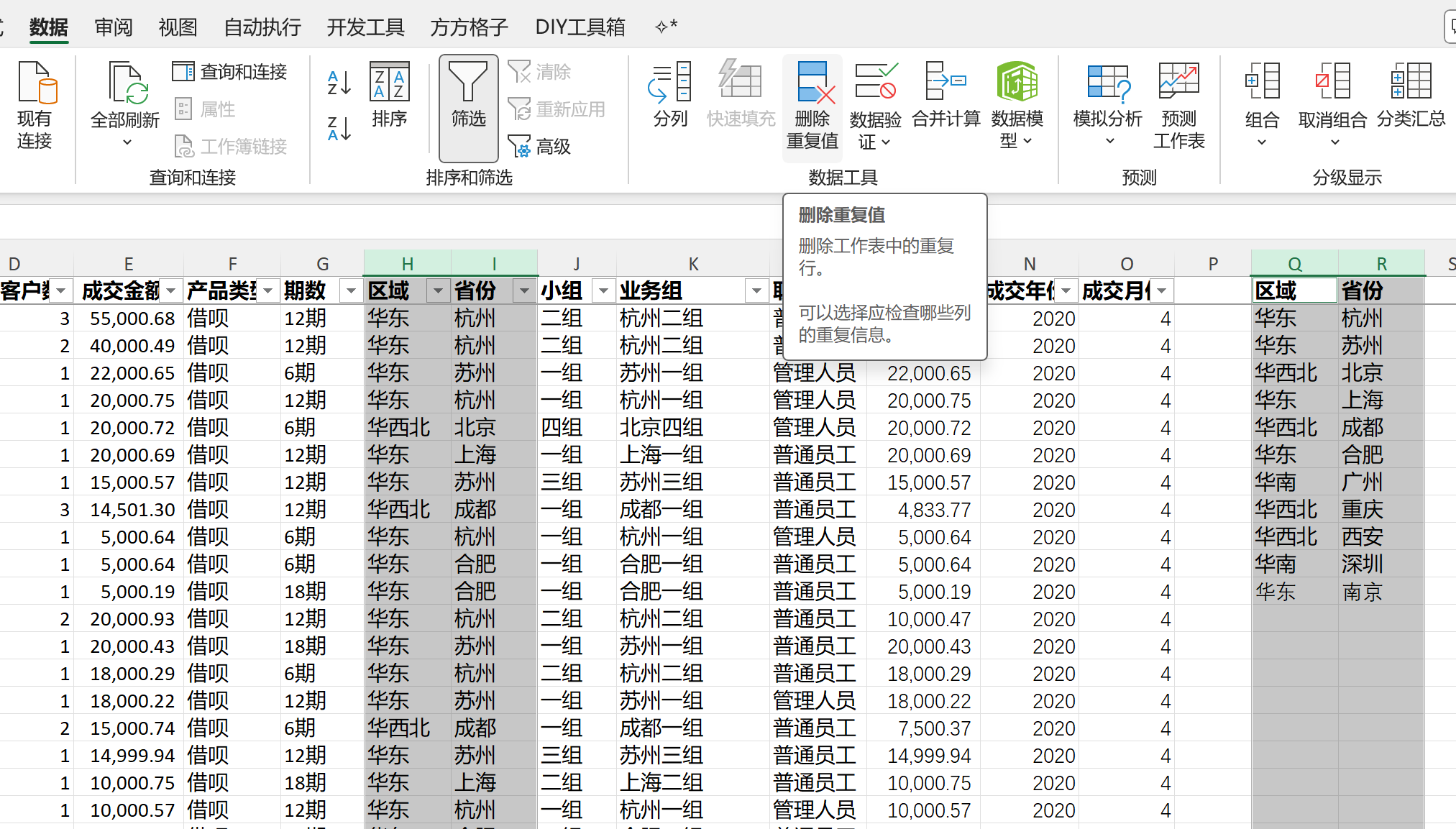 除了unique函数外,还可以通过 Excel 自带功能:数据 → 删除重复值,提取出唯一值。并且这个功能,还能选多列,比如: