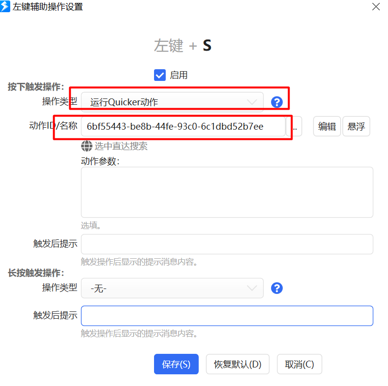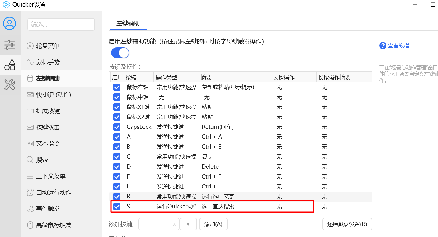 在 Quicker 设置窗口中,将“左键辅助”的 S 键操作类型改为 运行 Quicker 动作,并绑定本动作。