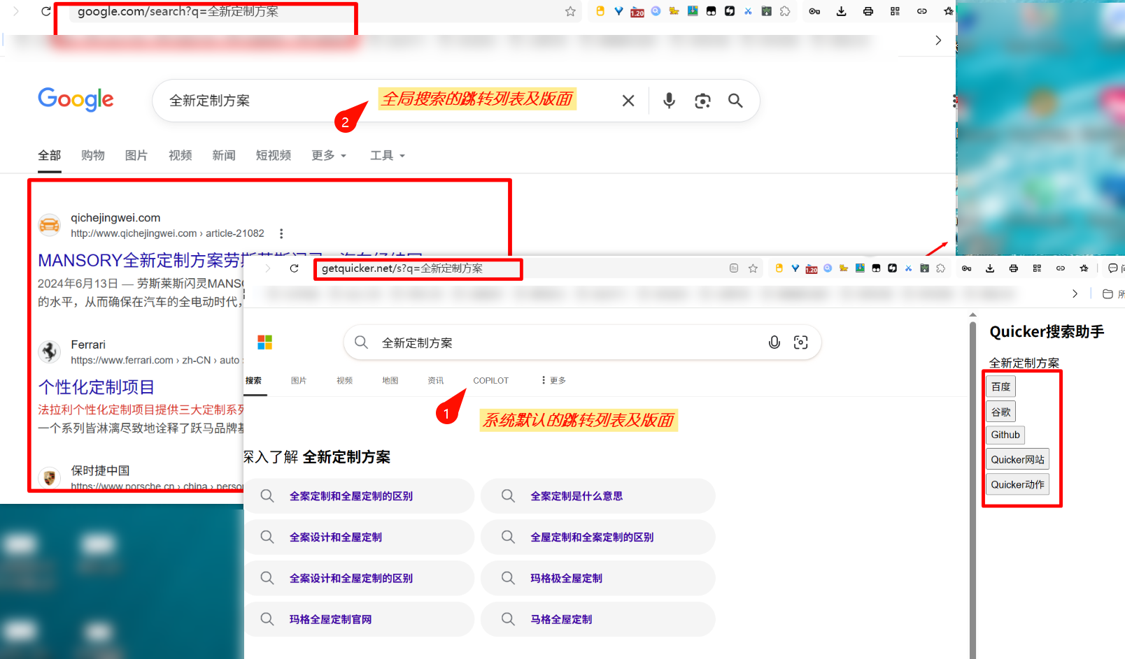 Quicker 的左键辅助中确实提供了“在线搜索选中文字”选项,选中文字后可直接跳转搜索。但问题在于——它固定跳转到 必应 的搜索结果页。