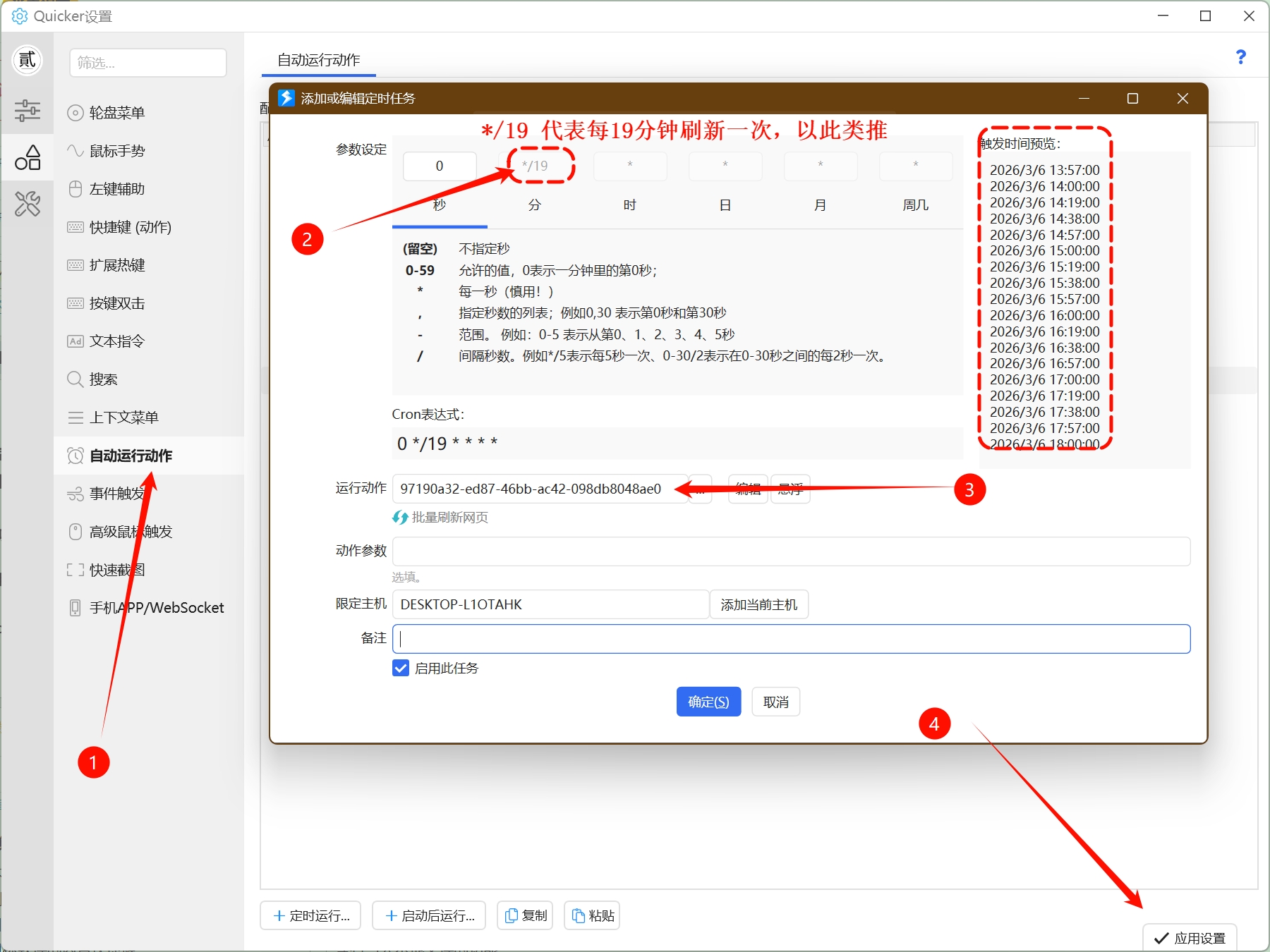 功能,定时启动本动作,进行自动定时刷新指定的网址,设置如下: