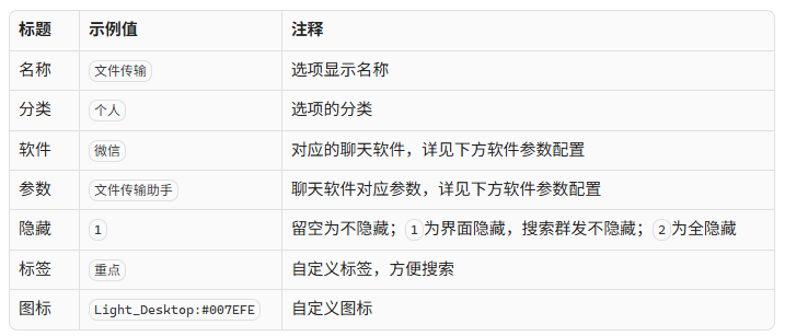 模板的 7 个标题(名称、分类、软件、参数、隐藏、标签、图标)请勿修改,H 列(第 8 列)开始可以自定义内容,方便模板内容筛选等