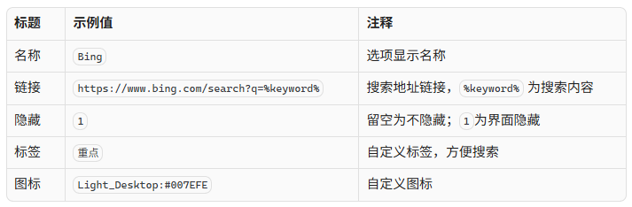 模板的 5 个标题(名称、链接、隐藏、标签、图标)请勿修改,F 列(第 6 列)开始可以自定义内容,方便模板内容筛选等