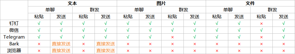 支持发送到私聊和群聊,群发图片、文件时不支持仅粘贴模式,仅可直接发送,文字均支持