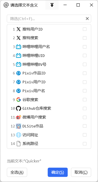 例如,你选中了「Quicker」文本,然后使用本脚本,你将获得以下弹窗: