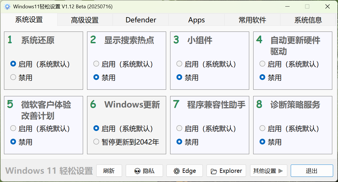 Windows11 轻松设置是一款专为 Windows 11 系统(Windows 10 亦可用哦~)设计的免费、无广告、便携式系统优化与配置工具,通过图形化界面将复杂的系统设置简化为一键操作,帮助用户快速启用或禁用常用功能(如小组件、搜索热点、驱动更新等),并支持暂停 Windows 更新至 2042 年,显著提升系统使用体验与个性化控制能力。