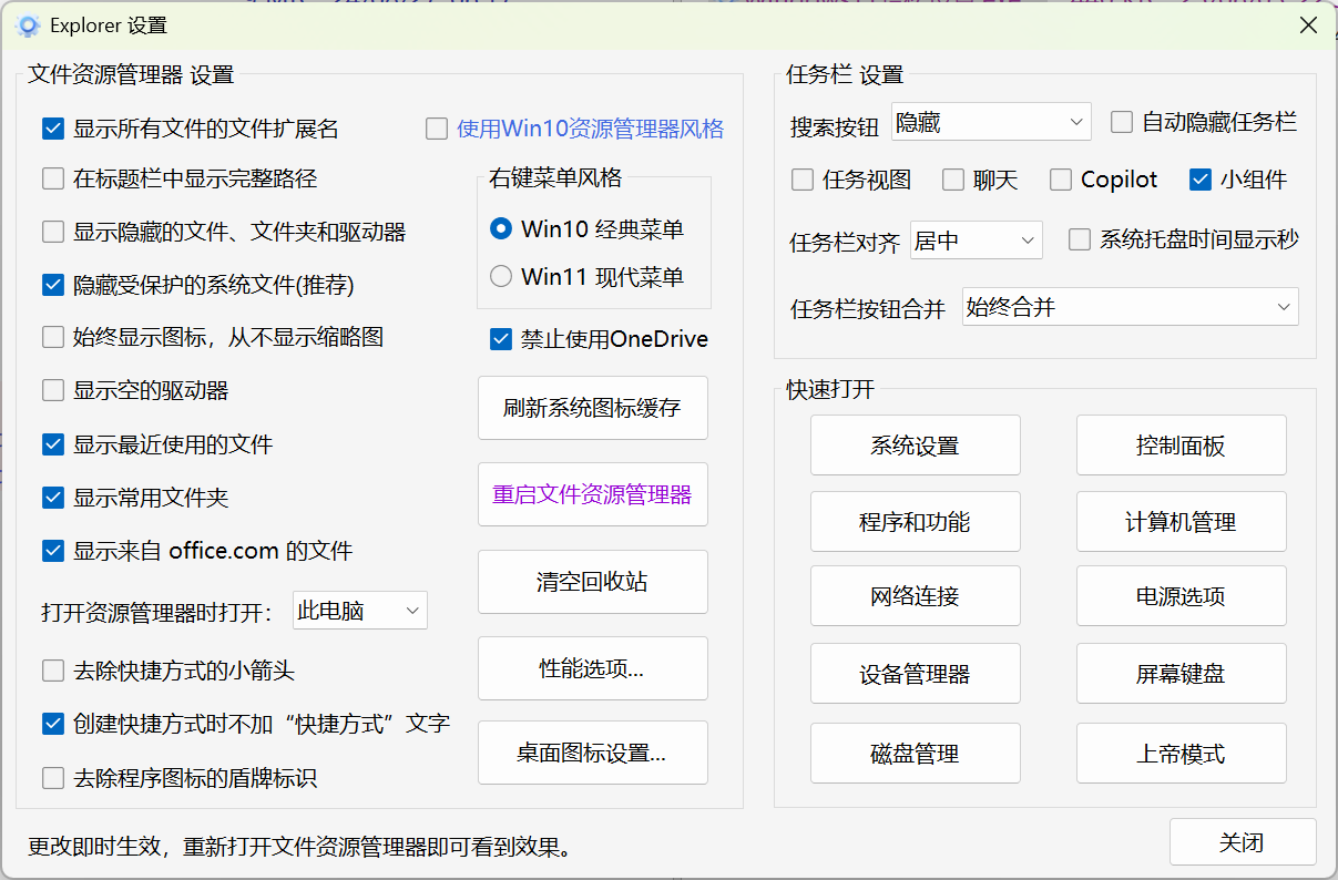 Win10资源管理器风格还原:支持在 Windows 11 22H2 及以上版本中一键切换回 Windows 10 风格的文件资源管理器界面,满足怀旧或操作习惯需求。