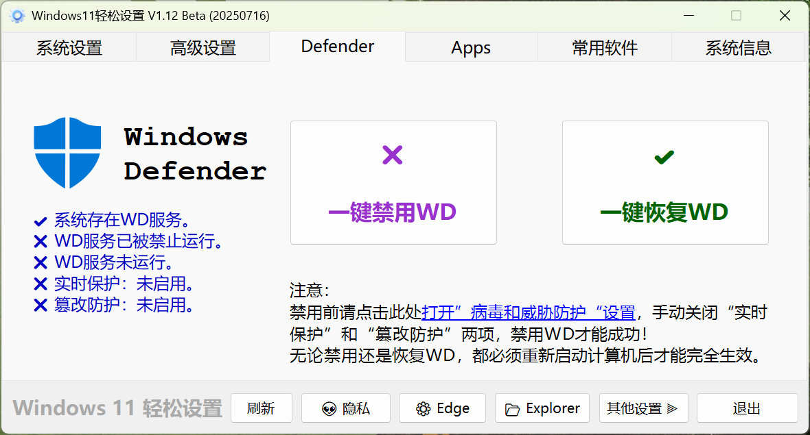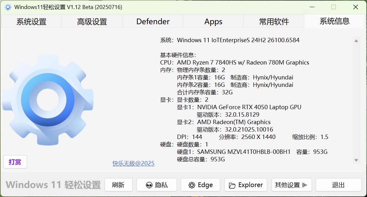 一键系统优化:集成多项高频设置项,如禁用 Defender、关闭自动更新、停用小组件等,用户只需勾选即可生效,无需深入系统设置。