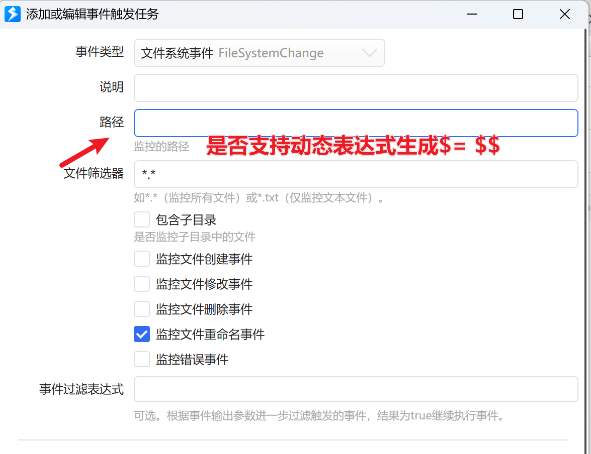 事件任务触发中的文件系统事件中的路径,是否可支持动态路径,因为每台电脑的路径不一定相同,例如桌面路径,此时需要动态生成。是否可以像赋值模块一样,直接使用表达式生成